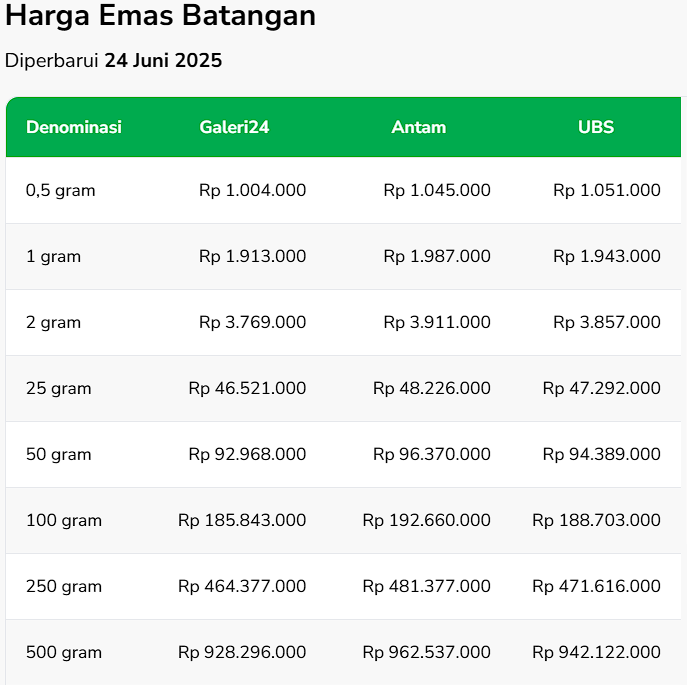 Pegadaian adalah salah satu anak usaha PT Bank Rakyat Indonesia (Persero) Tbk (BBRI). Berikut perkembangan harga emas di Pegadaian selengkapnya, seperti dilansir situs Sahabat Pegadaian per tanggal 24 Juni 2025: