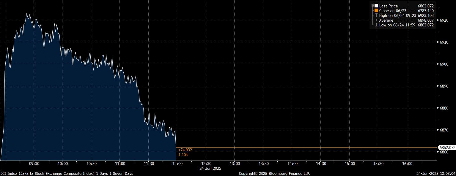 Bloomberg Technoz, Jakarta - IHSG berhasil menutup perdagangan di zona hijau dengan menguat 1,1% di posisi 6.862,07 pada Selasa (24/6/2025). Adapun IHSG melaju positif merupakan respons dari konflik di Timur Tengah yang mulai mereda, setelah Presiden AS Donald Trump mengumumkan gencatan senjata sementara.