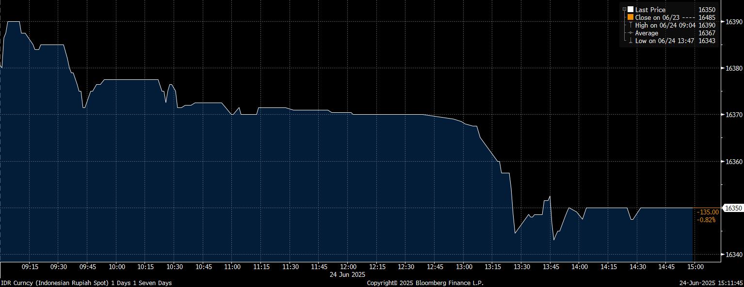 Rupiah menguat di pasar spot pada Selasa siang hari ini sejalan dengan mayoritas mata uang yang juga kompak menguat tersengat harapan meredanya ketegangan di Timur Tengah, berbalik arah karena optimisme Iran dan Israel tampaknya mendekati jeda atas perang 12 hari mereka setelah Presiden Donald Trump mengumumkan gencatan senjata.