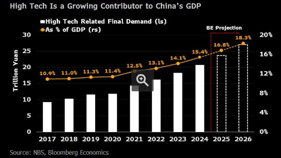 Bloomberg Economics memperkirakan kontribusi teknologi tinggi terhadap produk domestik bruto (PDB) China naik menjadi sekitar 15% pada tahun 2024 - dari sekitar 14% tahun sebelumnya - dan dapat melebihi 18% pada tahun 2026.