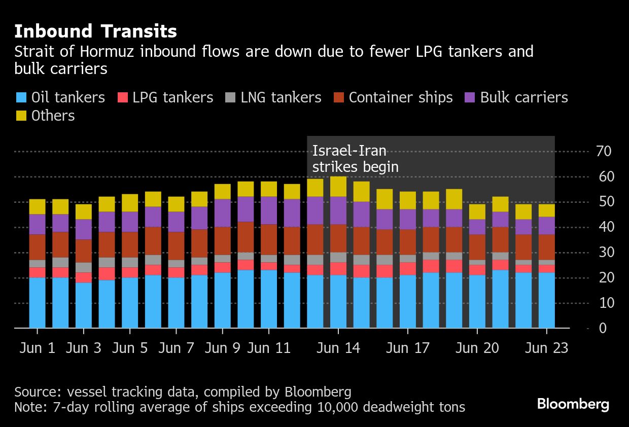 Rata-rata pergerakan tujuh hari kapal tanker minyak yang meninggalkan (outbound) Teluk Persia turun menjadi 20, dari rata-rata 22 kapal sejak konflik dimulai pada 13 Juni. Arus masuk (inbound) pun sejalan dengan rata-rata outbound.