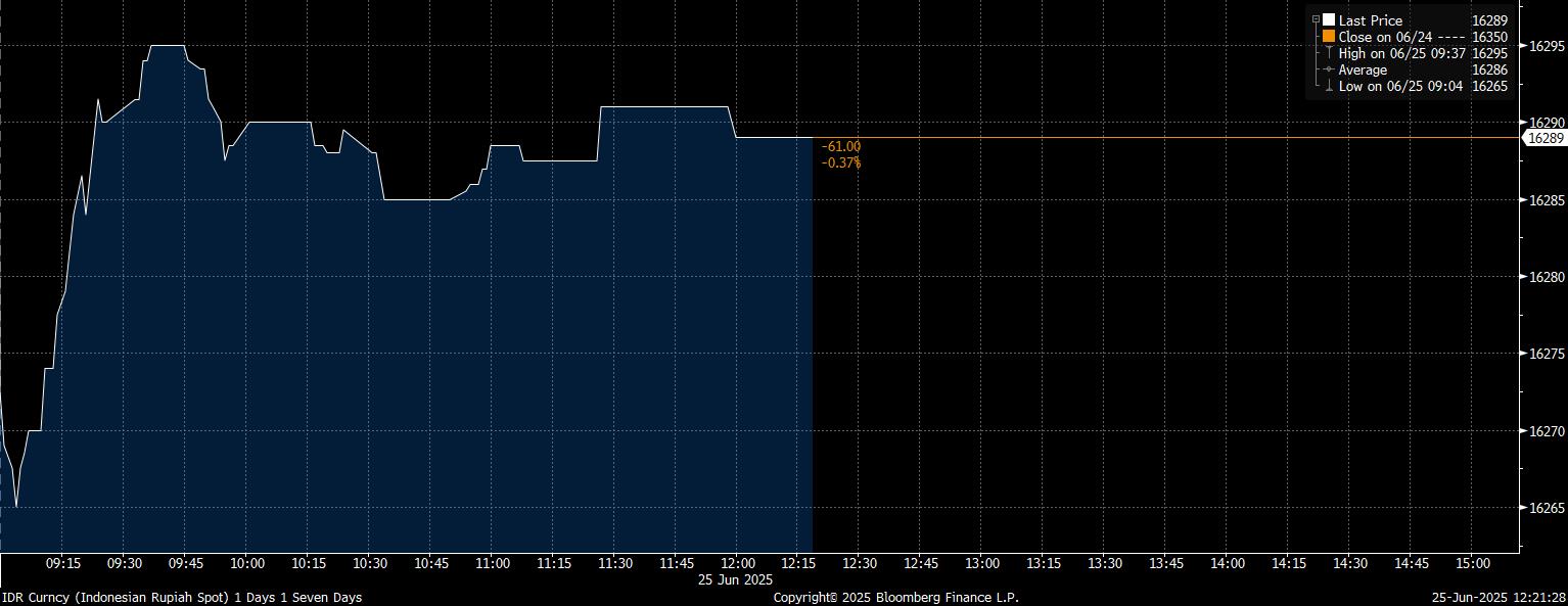 Pada Kamis (25/6/2025) pukul 12:20 WIB, US$ 1 setara dengan Rp 16.289 di perdagangan pasar spot. Rupiah terapresiasi 0,37% dibandingkan posisi penutupan perdagangan hari sebelumnya.