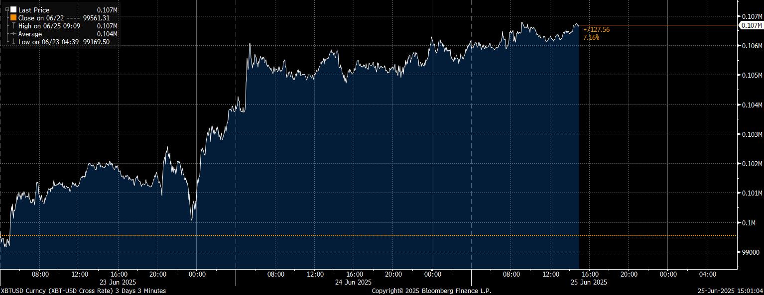 Bloomberg Technoz, Jakarta - Bitcoin berhasil rebound dengan cepat dari penurunan terdalam yang sempat menyentuh US$98.000 di dua hari yang lalu. Penguatan Bitcoin merespons kabar terbaru dari Presiden AS Donald Trump yang mengumumkan gencatan senjata antara Iran dan Israel yang telah terlibat konflik selama 12 hari.