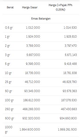 Berikut daftar harga emas Logam Mulia Antam selengkapnya untuk hari ini: