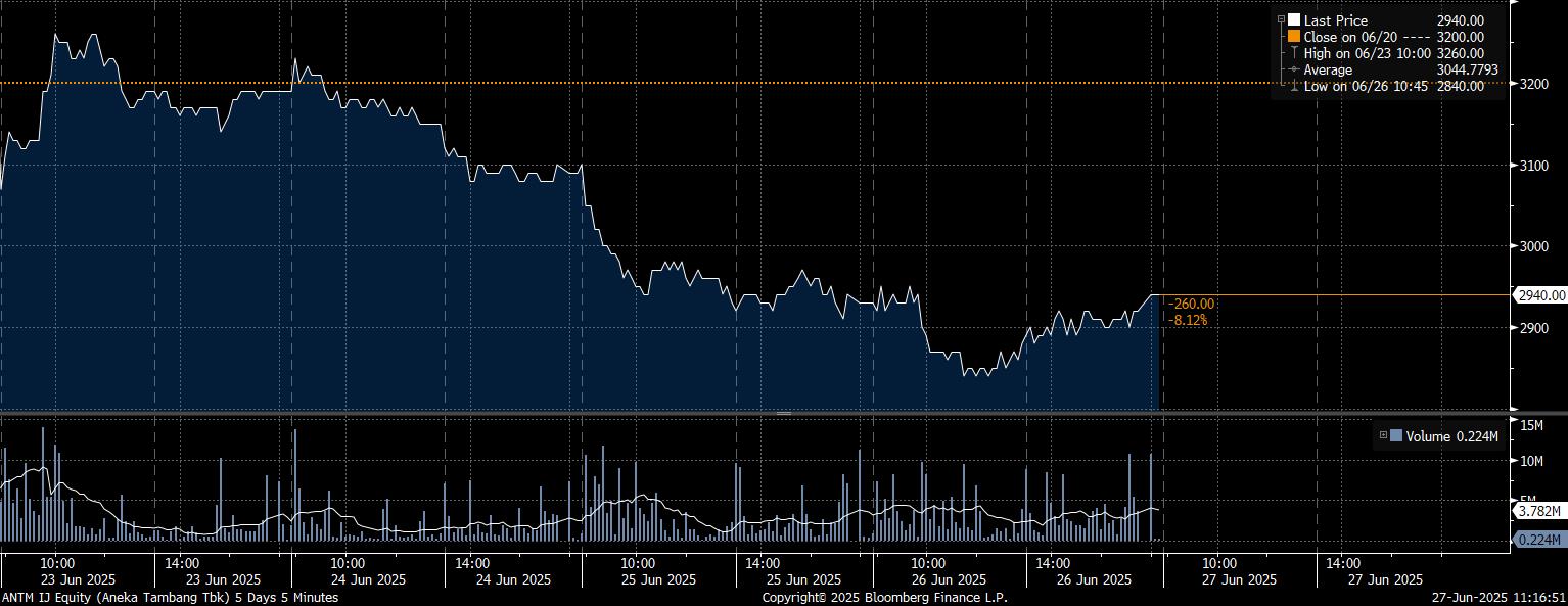 Pada kesempatan yang sama, investor asing tercatat net buy saham terbanyak pada emiten PT Aneka Tambang Tbk (ANTM) mencapai Rp182,73 miliar. Berseberangan jauh dengan tren pembelian yang masif, saham ANTM justru melemah 8,12% dalam sepekan ke posisi Rp2.940/saham.