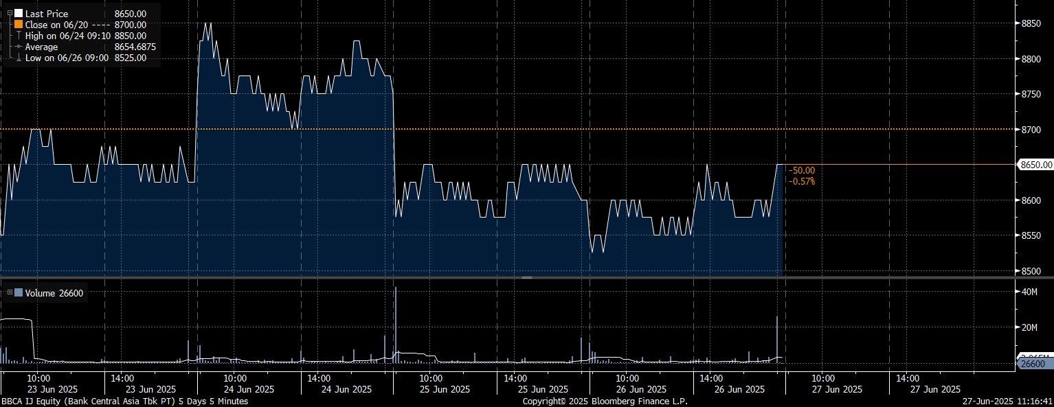 Adapun investor asing mencatat net sell tertinggi pada saham besar RI, saham PT Bank Central Asia Tbk (BBCA) mencapai Rp860,65 miliar. Imbas tekanan jual investor asing, saham BBCA melemah 0,57% dalam sepekan di posisi Rp8.650/saham.
