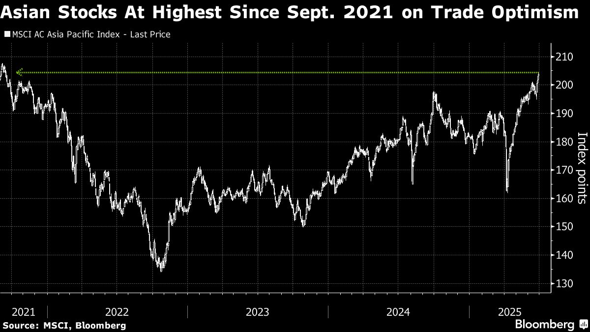 Bloomberg, Bursa saham Asia dibuka menguat seiring kenaikan indeks saham AS ke level tertinggi sepanjang masa dan kemajuan negosiasi dagang yang memicu minat investor terhadap aset berisiko.