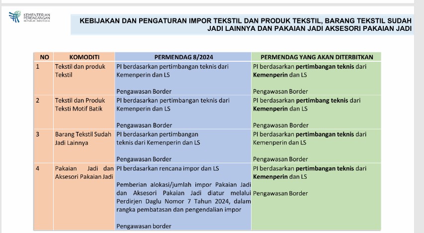 Namun, untuk industri TPT, terkhusus produk pakaian jadi dan aksesori pakaian jadi, tetap menggunakan Pertek dan Laporan Surveyor (LS), yang sebelumnya adalah PI berdasarkan rencana impor dan LS.