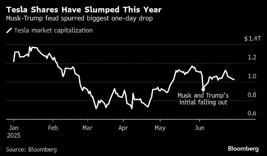 Saham Tesla anjlok hingga 5,7% pada perdagangan awal Selasa dan turun 4,9% pada pukul 5.15 pagi di New York. Saham tersebut merosot 14% pada 5 Juni, saat Musk dan Trump pertama kali berselisih mengenai RUU anggaran.