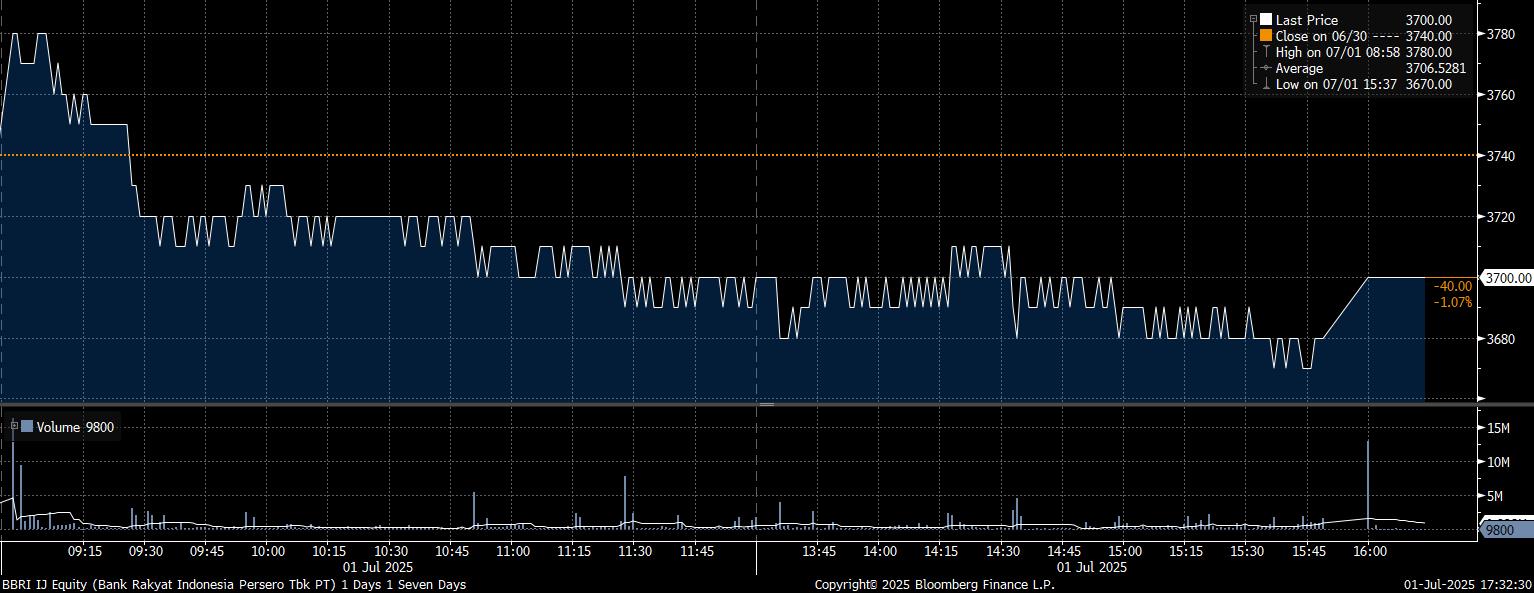 Adapun investor asing net sell yang besar pada saham PT Bank Rakyat Indonesia Tbk (BBRI) mencapai Rp200,17 miliar. Imbas tekanan jual yang deras, saham BBRI melemah 1,07% hingga menutup hari di posisi Rp3.700/saham.