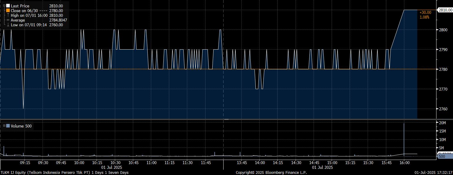 Bloomberg Technoz, Jakarta - Pada perdagangan saham kemarin, Selasa 1 Juli 2025, Indeks Harga Saham Gabungan (IHSG) ditutup di zona merah dengan melemah 12,31 poin (0,18%) hingga terpeleset di posisi 6.915,36. Saat IHSG merah, investor diam-diam akumulasi saham TLKM.