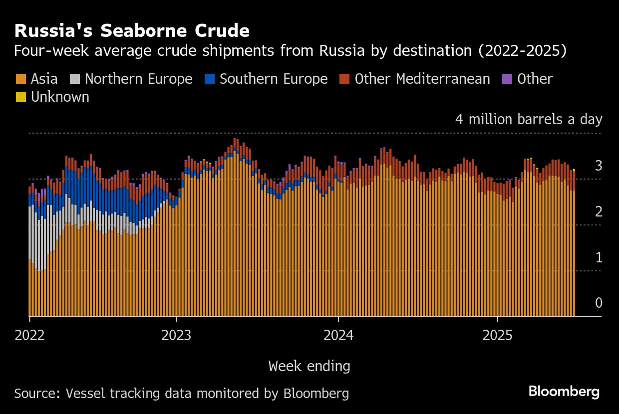 Pengiriman yang diamati ke pelanggan Rusia di Asia, termasuk yang tidak menunjukkan tujuan akhir, naik menjadi 2,79 juta bph dalam 28 hari hingga 29 Juni, naik dari 2,74 juta bph dalam empat pekan hingga 22 Juni.