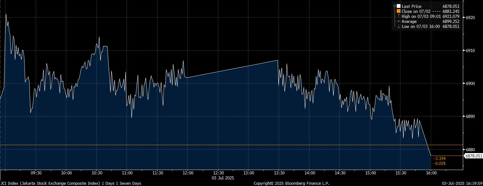 Bloomberg Technoz, Jakarta - Indeks Harga Saham Gabungan (IHSG) alhasil ditutup di zona merah dengan melemah 0,05% dan 3,19 poin di posisi 6.878,05 di penutupan perdagangan Kamis (3/7/2025). Jauh berbeda dengan pagi tadi imbas saham–saham keuangan yang ambles amat dalam.