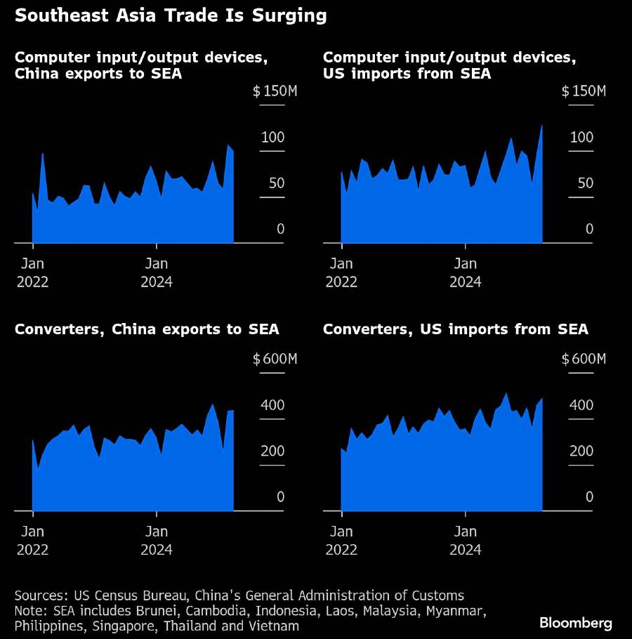 Ekonom Citigroup Inc dalam laporannya baru-baru ini menyebut pengiriman dari China ke Asia Tenggara mencapai rekor tertinggi di Indonesia, Malaysia, Thailand, dan Vietnam tahun ini. Dan ada "peningkatan korelasi yang signifikan" dengan peningkatan ekspor kawasan tersebut ke AS selama periode yang sama.
