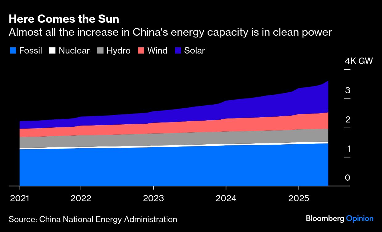 Bloomberg News memberitakan, pembangkit tenaga matahari dan angin di China memiliki kapasitas yang sudah melebihi energi fosil. Per Mei, pembangkit listrik tenaga matahari di China memiliki kapasitas puncak di 1,08 terawatt yang setara dengan 1.000 pembangkit tenaga nuklir.
