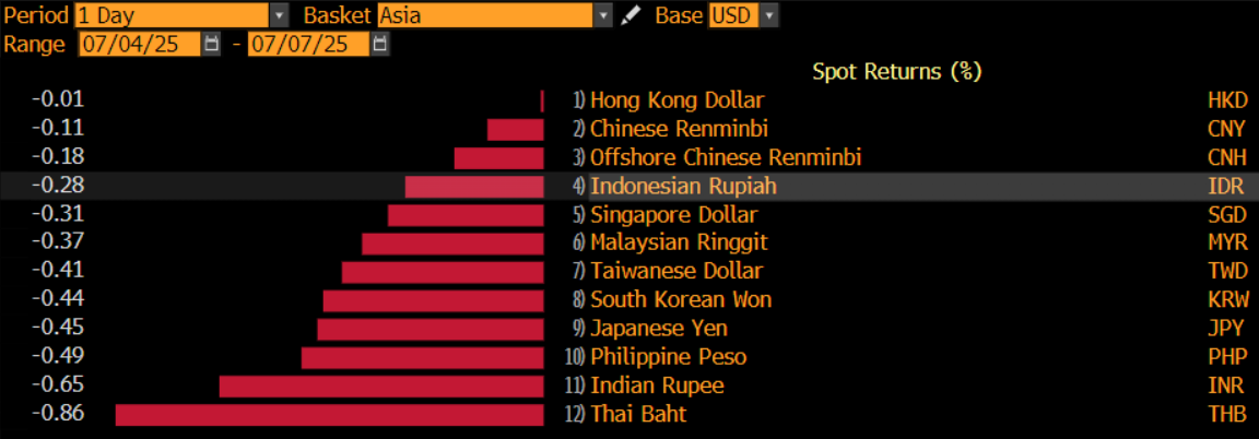 Dolar Hong Kong menjadi mata uang dengan depresiasi paling tipis yaitu 0,01%. Rupiah berada di peringkat 4, di bawah yuan China dan yuan offshore.