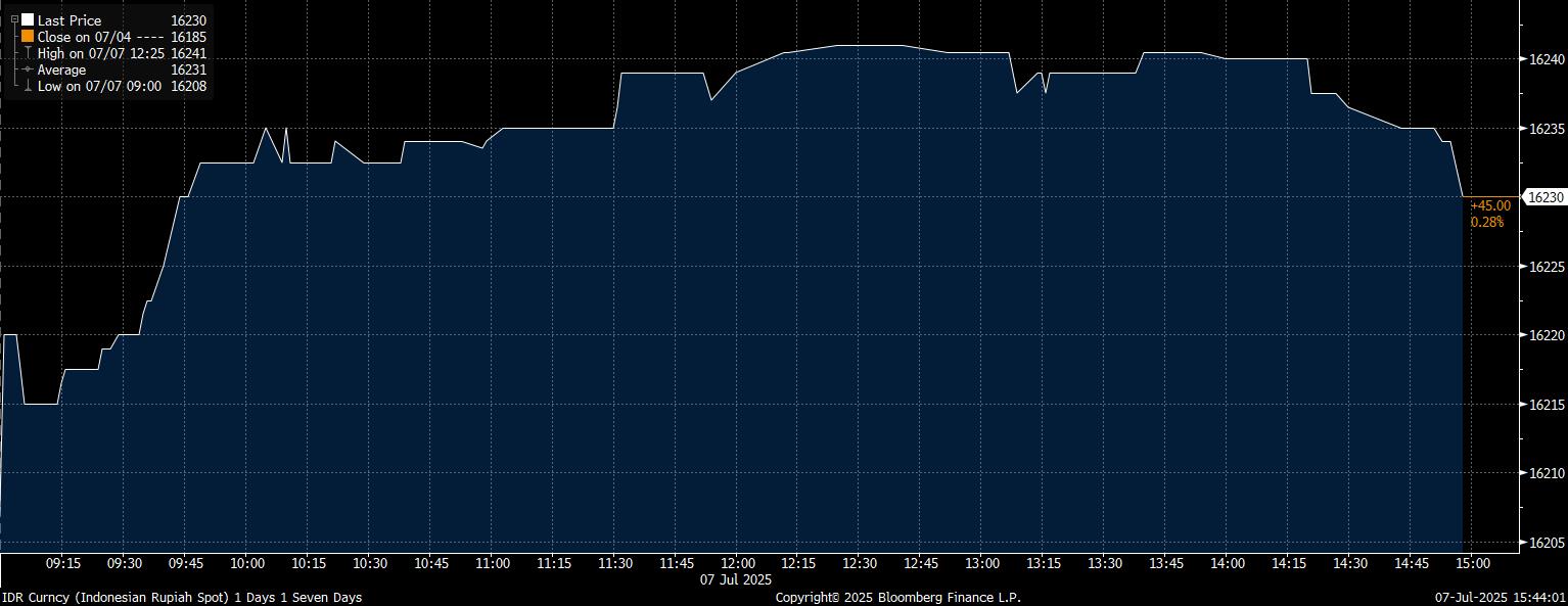 Pada Senin (7/7/2025), US$ 1 ekuivalen Rp 1.6230. Mata uang Tanah Air melemah 0,28% dibandingkan posisi penutupan perdagangan akhir pekan lalu.