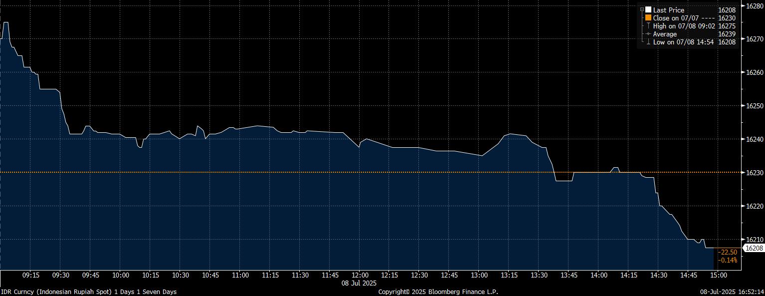 Penguatan rupiah berhasil tercatat mencapai 0,14% sampai tutup pasar. Reaksi pasar Asia yang beragam dan cenderung cuek terhadap perkembangan terbaru tarif yang digagas oleh Trump tadi malam kemungkinan karena para investor sudah menghitung dampak tarif, terutama ketika besarannya tidak berubah.