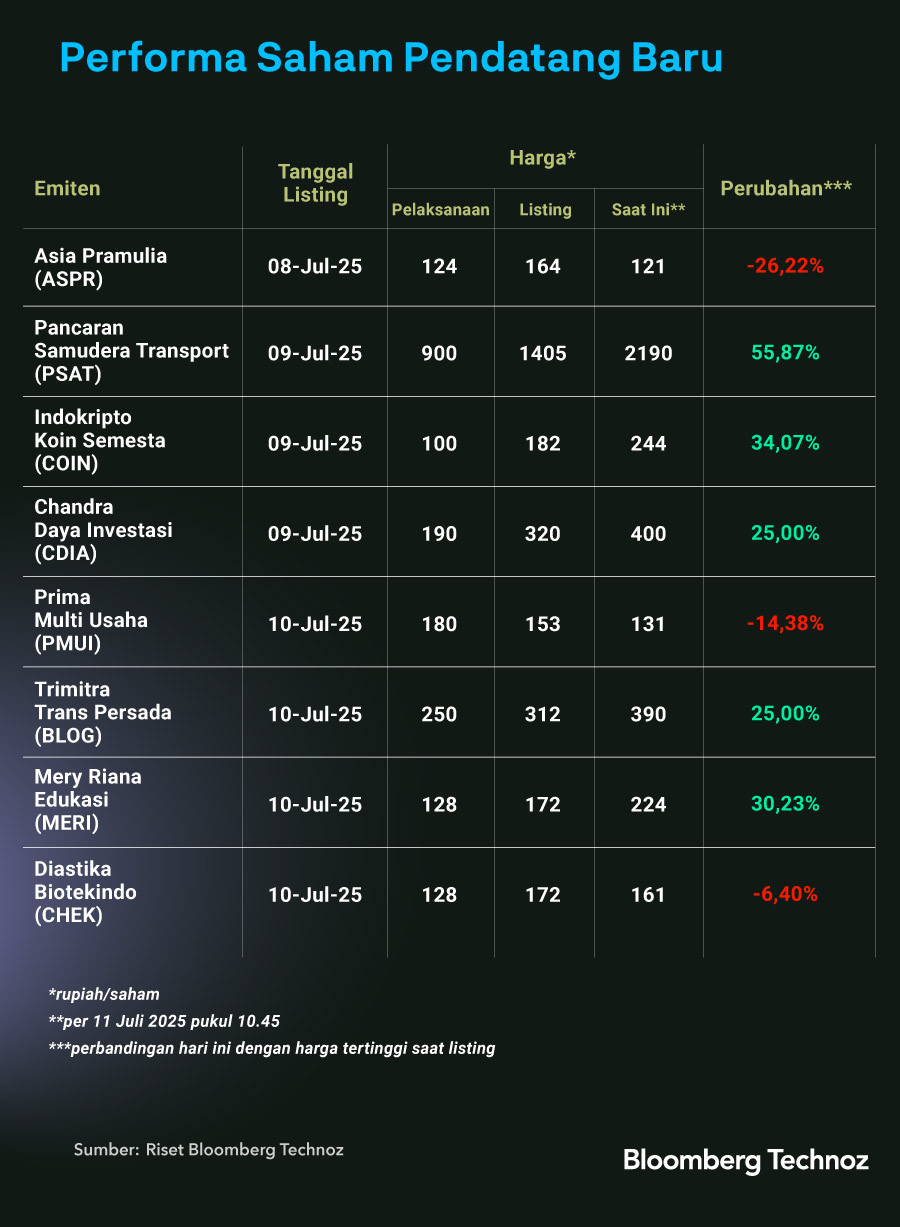 Bloomberg Technoz, Jakarta - Belum genap sepekan sejak melantai di Bursa Efek Indonesia (BEI), delapan emiten anyar yang resmi tercatat pada 8–10 Juli 2025 menunjukkan performa harga saham yang bervariasi. Dari data perdagangan per 11 Juli 2025 pukul 10.45 WIB, sebagian mencatatkan penguatan signifikan, namun tak sedikit yang justru terkoreksi dari harga saat listing.