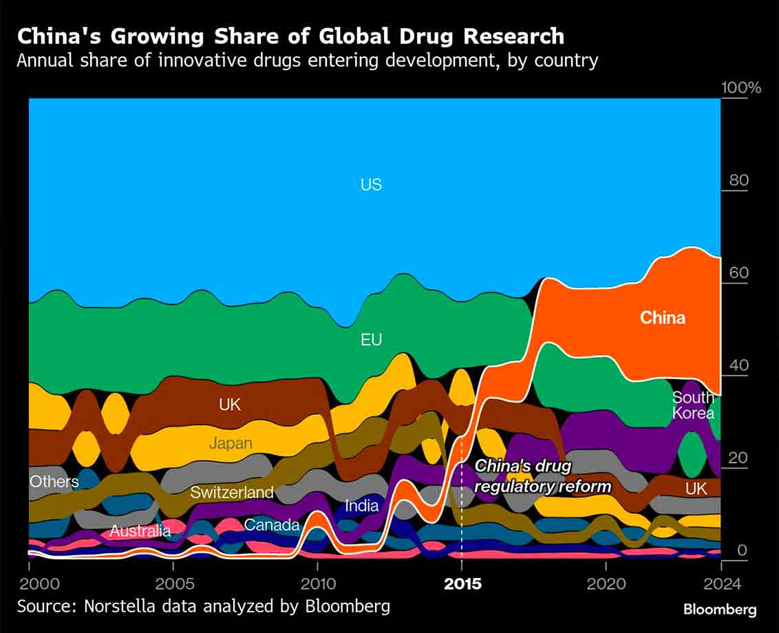Perubahan ini terjadi dengan kecepatan yang belum pernah terjadi sebelumnya. Ketika China mulai merombak sistem regulasi obatnya pada tahun 2015, negara tersebut hanya memiliki 160 senyawa yang berkontribusi pada pipeline global obat inovatif — kurang dari 6% dari total keseluruhan — tertinggal dari Jepang dan Inggris.