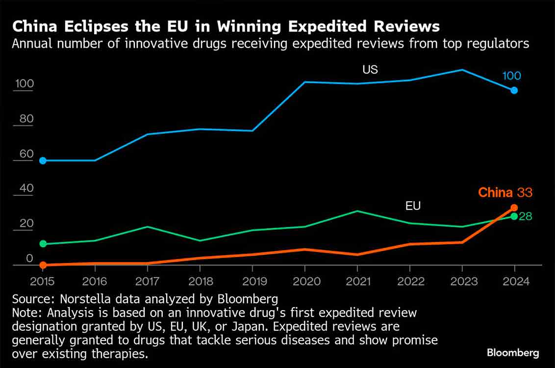 Data menunjukkan bahwa pada 2024, China kini sedikit lebih unggul dari Uni Eropa dalam memperoleh peninjauan cepat semacam itu — sebuah keunggulan yang luar biasa atas kawasan yang sebelumnya menghasilkan obat-obatan seperti Wegovy.