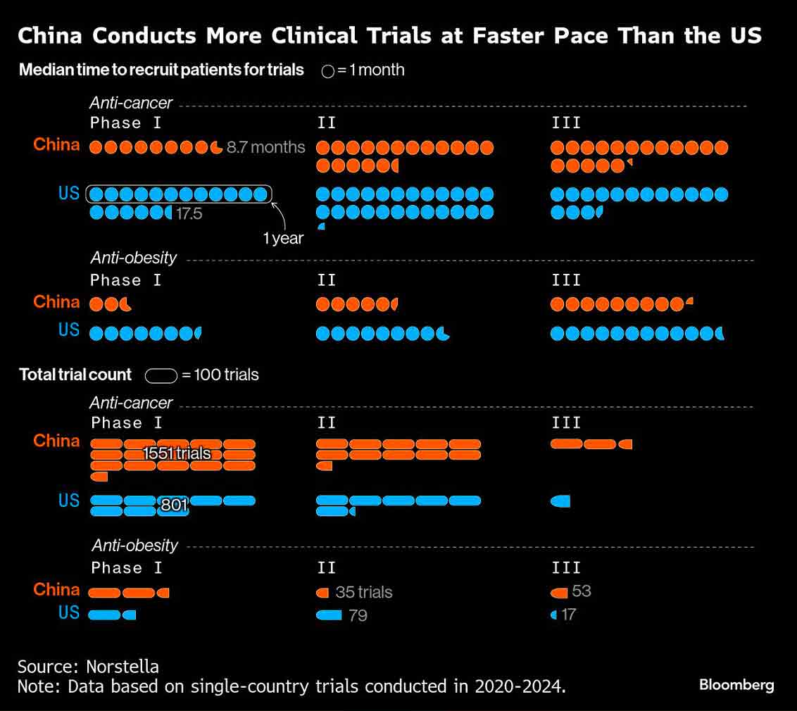 Menciptakan obat baru dari awal terkenal sangat memakan waktu dan mahal, dan besarnya jumlah pasien serta jaringan rumah sakit terpusat di China telah menjadi pendorong signifikan. Analisis terhadap durasi waktu yang dibutuhkan dalam berbagai tahap pengujian menunjukkan bahwa dokter di China dapat merekrut peserta uji klinis jauh lebih cepat — untuk uji tahap awal obat kanker dan obesitas, mereka bisa menyelesaikan perekrutan pasien dalam waktu setengahnya dibandingkan di AS.