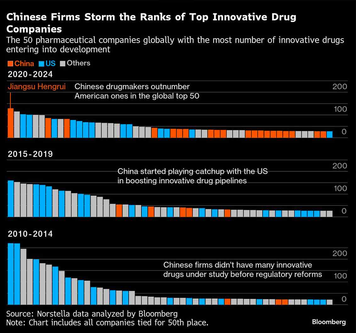 Dari 50 perusahaan yang menghasilkan jumlah kandidat obat inovatif terbanyak antara tahun 2020 dan 2024, sebanyak 20 berasal dari China — dibandingkan hanya lima perusahaan dalam lima tahun sebelumnya.