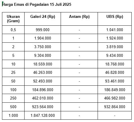 Sedangkan untuk ukuran 1 gram, harga emas Galeri 24 di Pegadaian adalah Rp 1.904.000. Terangkat Rp 5.000 dalam sehari.