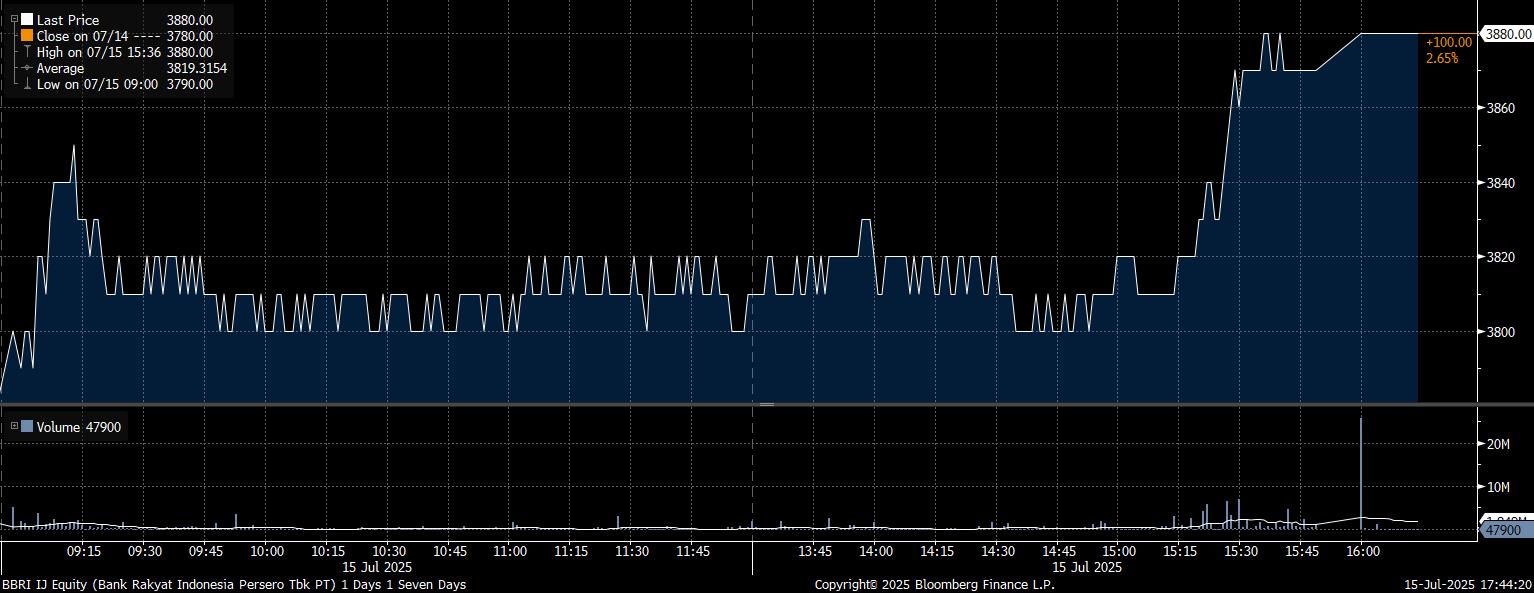 Sedang, investor asing mencatatkan net buy terbanyak pada saham PT Bank Rakyat Indonesia Tbk (BBRI) mencapai Rp195,44 miliar. Seiringan dengan tren pembelian, saham BBRI menguat 2,65% hingga melesat di posisi Rp3.880/saham.