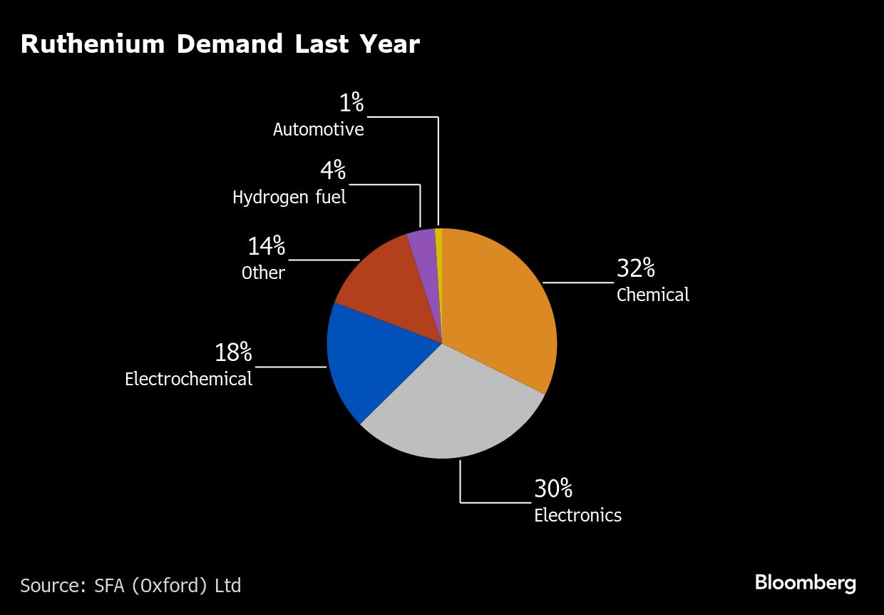 Rutenium juga sangat sulit didapat. Pasokan tahunan mineral ini, yang sebagian besar berasal dari produk sampingan platinum, hanya 30 ton tahun lalu, dan diperkirakan turun karena kurangnya investasi setelah bertahun-tahun harga mengalami penurunan, kata Kaler.