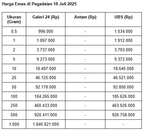 Sedangkan untuk ukuran 1 gram, harga emas Galeri 24 di Pegadaian adalah Rp 1.897.000. Bertambah Rp 9.000 dalam sehari.