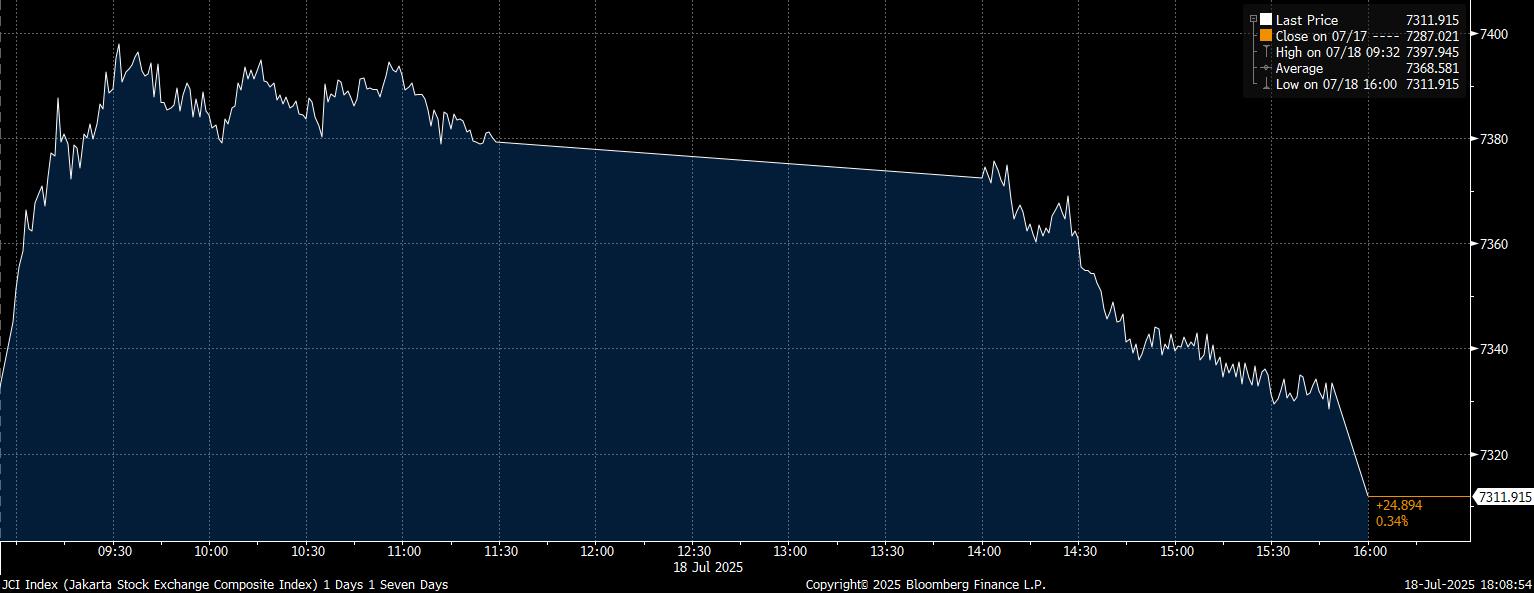Bloomberg Technoz, Jakarta - Indeks Harga Saham Gabungan (IHSG) ditutup menguat dengan kenaikan 24,89 poin (0,34%) di posisi 7.311,91 pada Jumat (18/7/2025). Adapun IHSG sempat menguat hingga 1,3% pagi tadi, di tengah ekspektasi pasar untuk keputusan FOMC The Fed pada 30 Juli nanti.