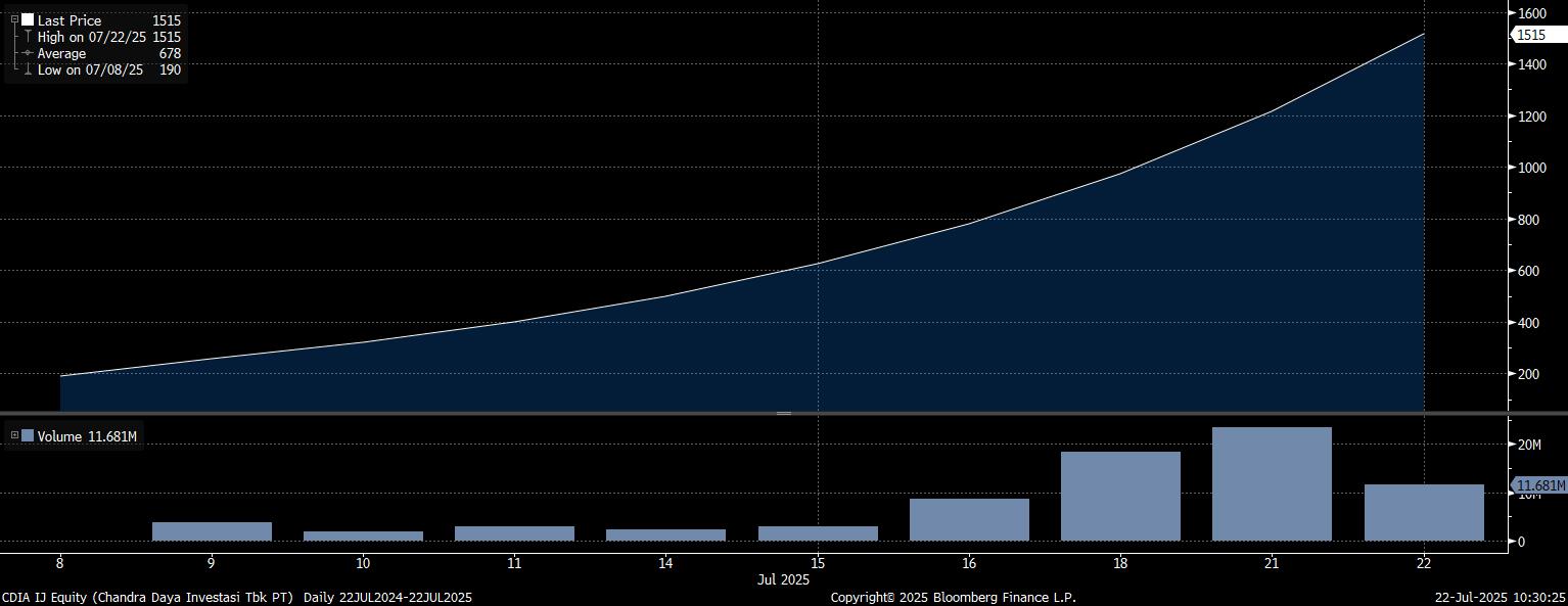Pada Senin (21/7/2025) kemarin, ARA tersentuh ketika perusahaan dengan kode CDIA itu melesat 240 poin, atau melejit 24,62% ke level Rp1.215/saham hingga tutup perdagangan.