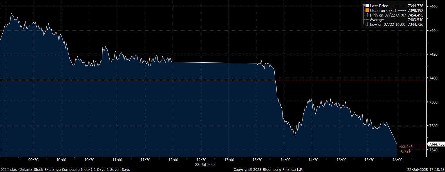 IHSG menutup perdagangan dengan ada di posisi terendahnya sepanjang hari 7.344,73. Adapun level tertinggi sempat terjadi sesaat di posisi 7.457,38 yang merupakan harga saat perdagangan pagi–siang hari.