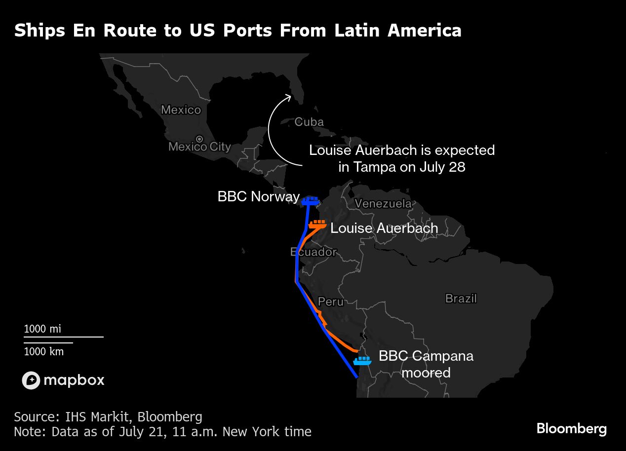Kapal kargo Louise Auerbach berada di dekat pelabuhan Buenaventura, Kolombia, dan sedang dalam perjalanan untuk tiba di Tampa, Florida, pada 28 Juli, menurut data yang dikumpulkan oleh Bloomberg dan sumber-sumber yang mengetahui pelayaran tersebut.