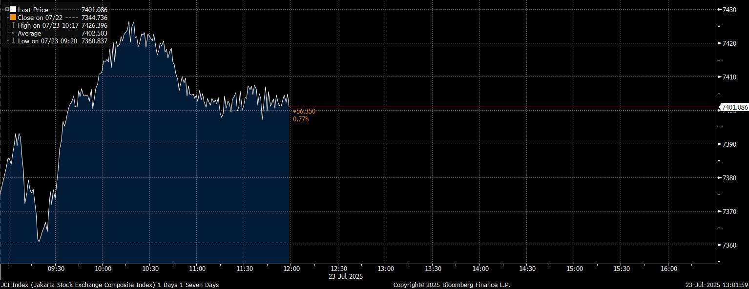 Bloomberg Technoz, Jakarta - Indeks Harga Saham Gabungan (IHSG) ditutup di zona hijau dengan menguat 0,77% dan 56,35 poin di posisi 7.401,08 pada Sesi I Rabu (23/7/2025). Melesatnya sejumlah saham–saham unggulan LQ45 menjadi faktor utama penguatan IHSG.
