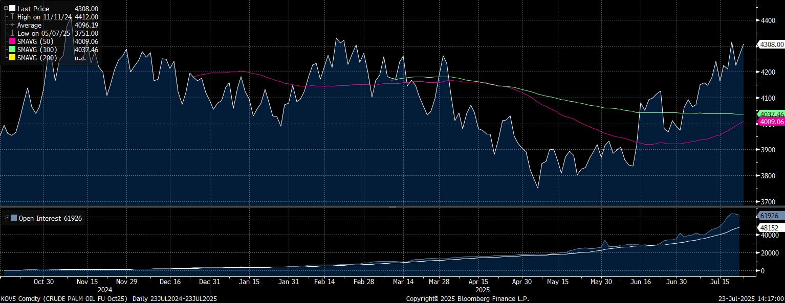 Pada Rabu (23/7/2025), harga CPO di Bursa Malaysia untuk kontrak pengiriman Oktober melesat di posisi MYR4.308/ton. Menguat nyaris 1% dibanding posisi penutupan perdagangan kemarin.