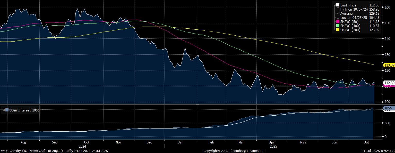 Pada Rabu (23/7/2025), harga batu bara di pasar ICE Newcastle untuk kontrak pengiriman bulan mendatang ditutup di US$112,3/ton. Nilai itu berubah tipis, hanya turun 0,1% dibandingkan dengan hari sebelumnya.