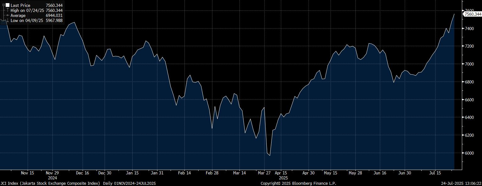 Pada Kamis (24/7/2025), IHSG berada di posisi 7.560 saat jeda penutupan perdagangan Sesi I. Naik 1,22% dibanding penutupan perdagangan sebelumnya. IHSG pun berhasil menempati posisi tertinggi sejak November atau lebih dari 8 bulan.