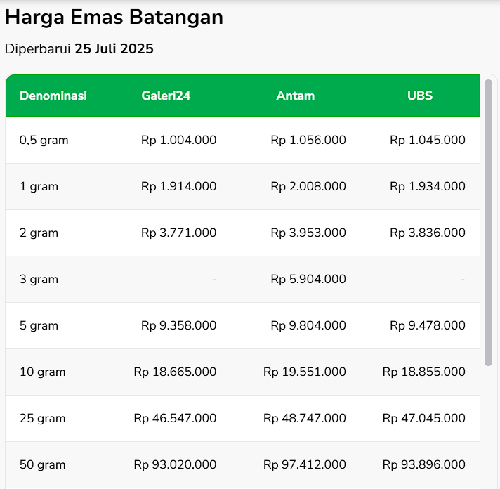 Lalu untuk emas batangan Galeri 24 ukuran 0,5 gram, Pegadaian menjual di harga Rp 1.004.000. Berkurang Rp 6.000 dibanding kemarin.