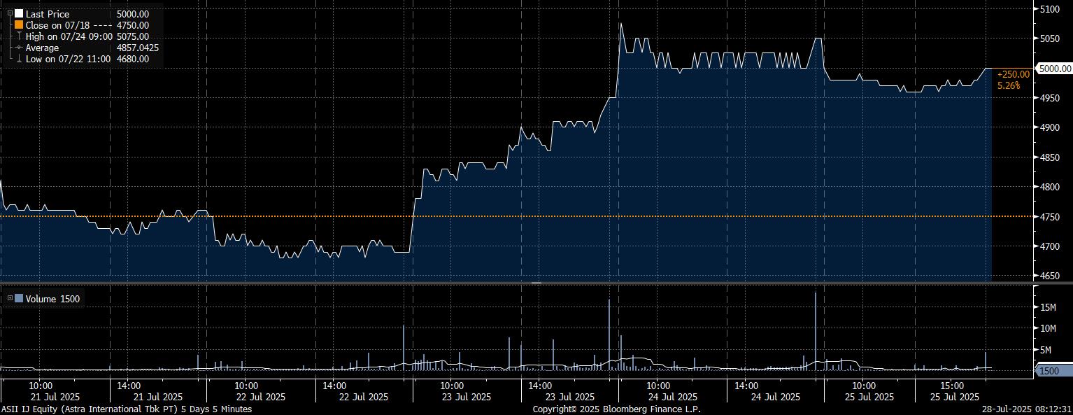 Adapun investor asing tercatat net buy saham terbanyak pada emiten PT Astra International Tbk (ASII) mencapai Rp561,58 miliar. Sejalan dengan tren pembelian yang masif, saham ASII menguat 5,26% dalam sepekan ke posisi Rp5.000/saham.