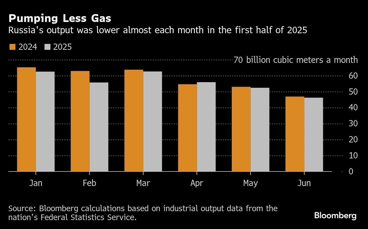 Negeri Beruang Merah memproduksi 334,8 miliar meter kubik gas alam dan gas ikutan hingga Juni, turun 3,2% dibandingkan dengan periode yang sama tahun lalu, menurut perhitungan Bloomberg berdasarkan data produksi industri dari Badan Pusat Statistik Federal.