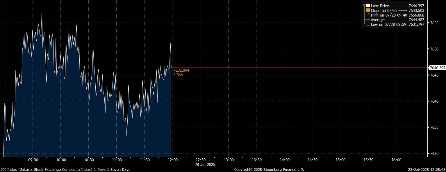 Pada Senin (28/7/2025) siang, IHSG Sesi I ditutup di posisi 7.646,39 dengan kenaikan 1,36% dan 102,89 poin dibandingkan dengan hari sebelumnya.