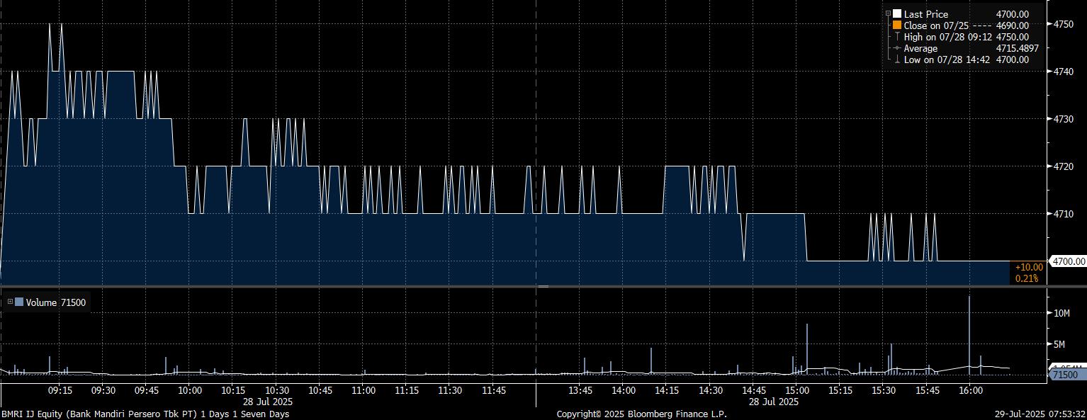 Sedang pada kesempatan yang sama, investor asing net sell yang besar pada saham PT Bank Mandiri Tbk (BMRI) mencapai Rp170,01 miliar. Berseberangan jauh dengan tekanan jual yang masif, saham BMRI tetap berhasil menguat 0,21% di posisi Rp4.700/saham.