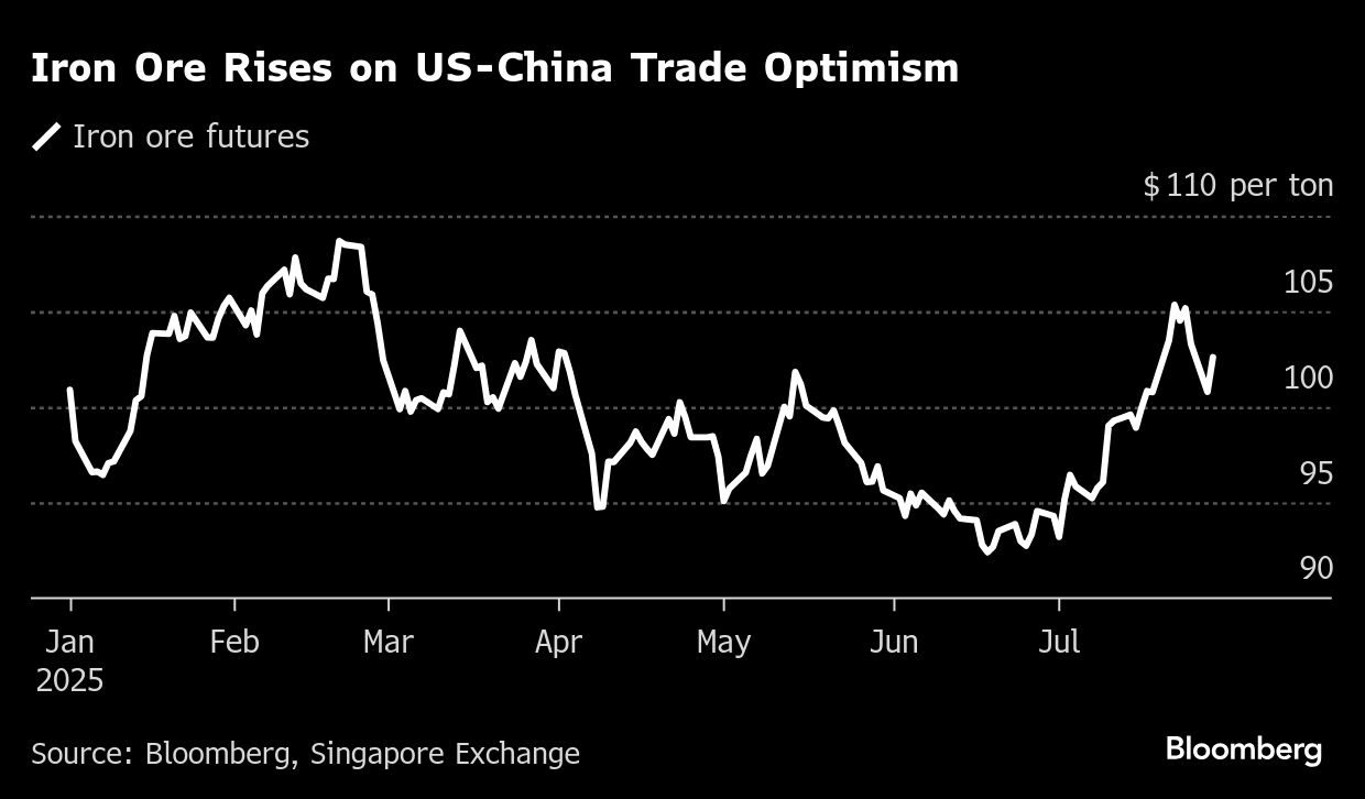 Hingga pukul 12:20 waktu Singapura, kontrak berjangka bijih besi naik 2% menjadi US$102,85 per ton. Kontrak berdenominasi yuan di Dalian juga menguat, seiring dengan kenaikan harga kontrak baja di Shanghai.