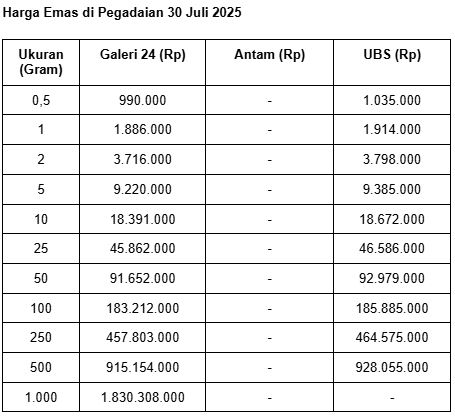 Sedangkan untuk ukuran 1 gram, harga emas Galeri 24 di Pegadaian adalah Rp 1.886.000. Dalam sehari, minus Rp 8.000.