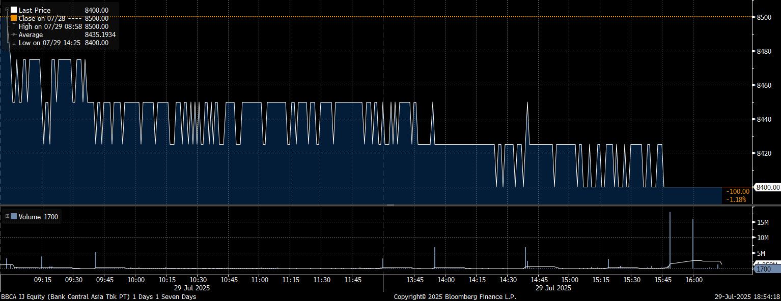 Adapun investor asing net sell yang besar pada saham PT Bank Central Asia Tbk (BBCA) mencapai Rp562,95 miliar. Imbas tekanan jual yang masif, saham BBCA melemah 1,18% di posisi Rp8.400/saham.