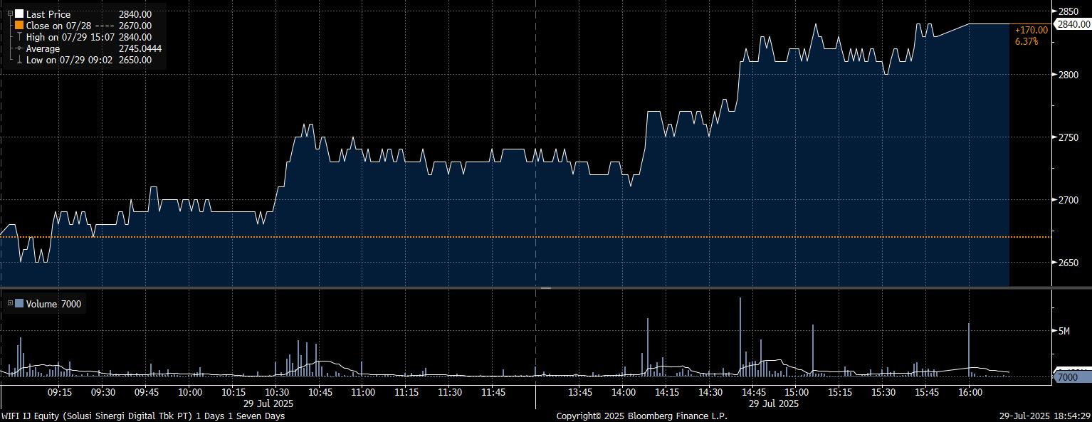 Sedang pada kesempatan yang sama, investor asing mencatatkan net buy terbanyak pada saham PT Solusi Sinergi Digital Tbk (WIFI) mencapai Rp90,86 miliar. Seiringan dengan tren pembelian, saham WIFI menguat 6,37% hingga melesat di posisi Rp2.840/saham.