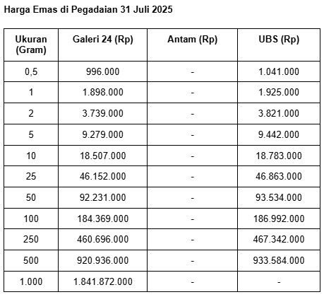 Lalu untuk emas batangan Galeri 24 ukuran 0,5 gram, Pegadaian menjual di harga Rp 996.000. Bertambah Rp 6.000 ketimbang kemarin.