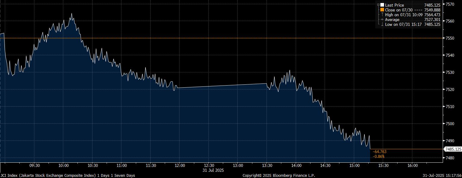 Bloomberg Technoz, Jakarta - Indeks Harga Saham Gabungan (IHSG) melemah siang hari ini mencapai kehilangan 0,86% ke level 7.485,12 pada perdagangan Kamis (31/7/2025). Tertekannya saham–saham Big Caps jadi sebab, terutama saham BBRI dan saham BBCA.